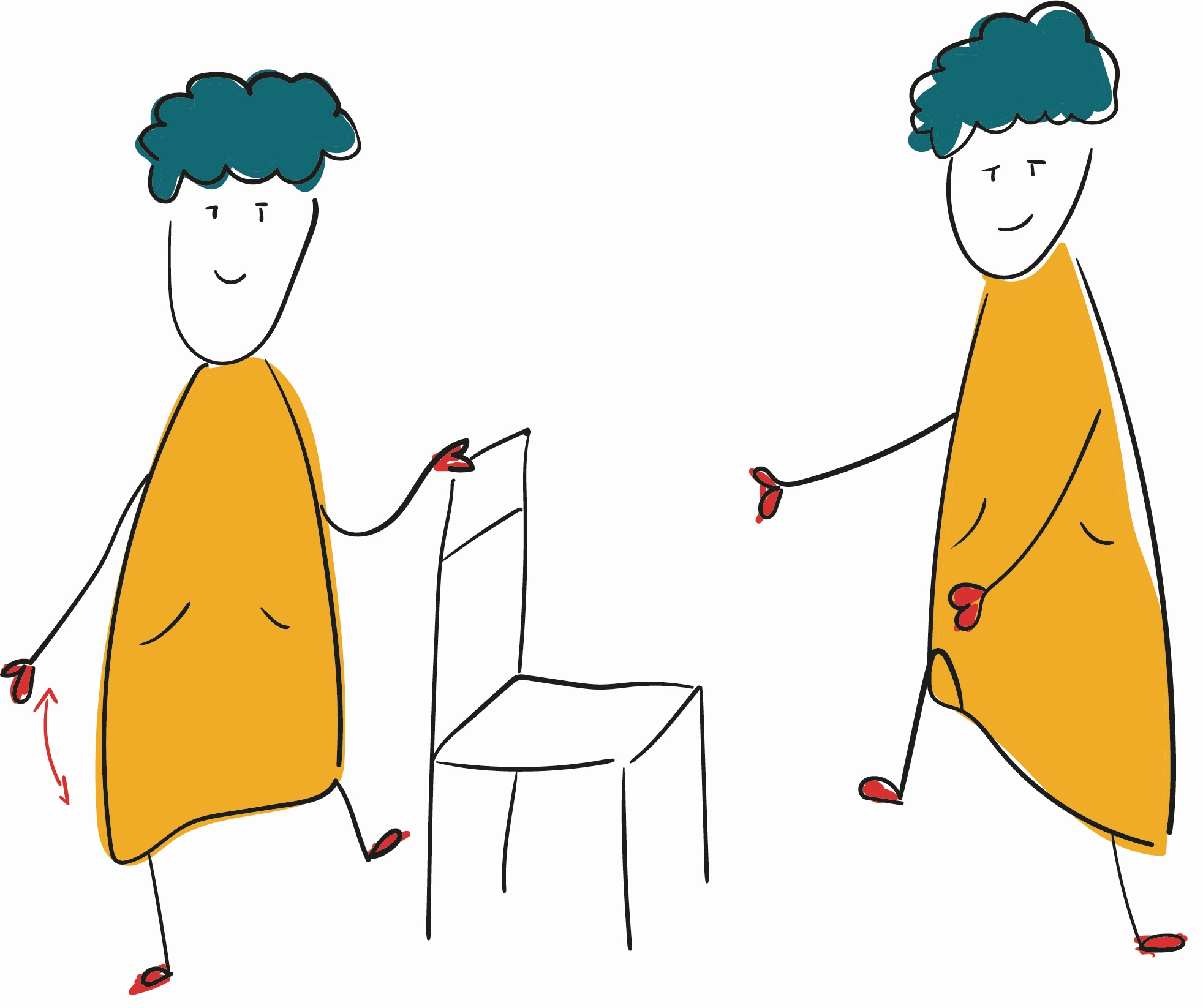 Im Gehen, eventuell an einem Stuhl festhalten oder im Sitzen. Arme locker gegengleich schwingen. Später die rechte Hand zum linken Knie und die linke Hand zum rechten Knie bringen.