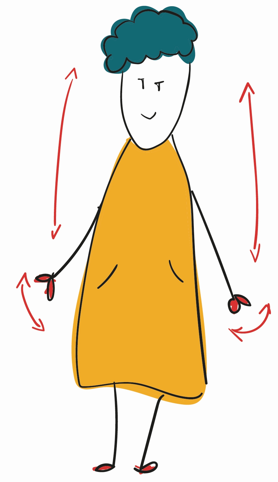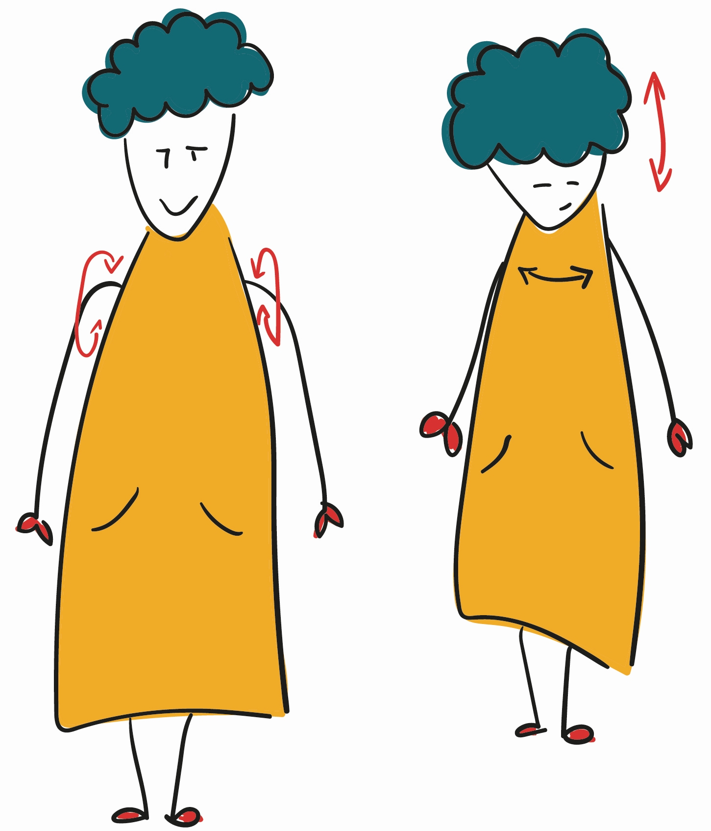 Schultern weit nach vorne, oben, unten und nach hinten kreisen. Arme hängen dabei locker neben dem Körper.