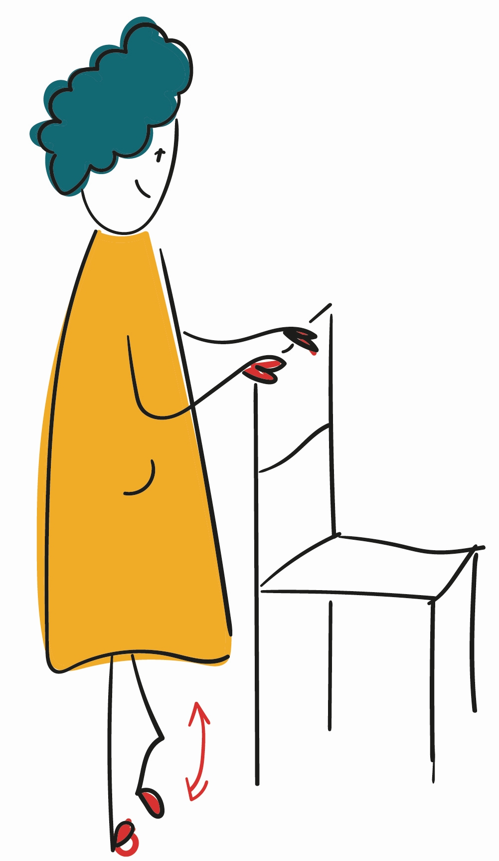 Auf einem Sessel sitzend abwechselnd die Füße auf die Fersen und auf die Zehen stellen. Zuerst beide Füße gleich, dann rechts und links abwechseln. Anschließend „Radfahren“.